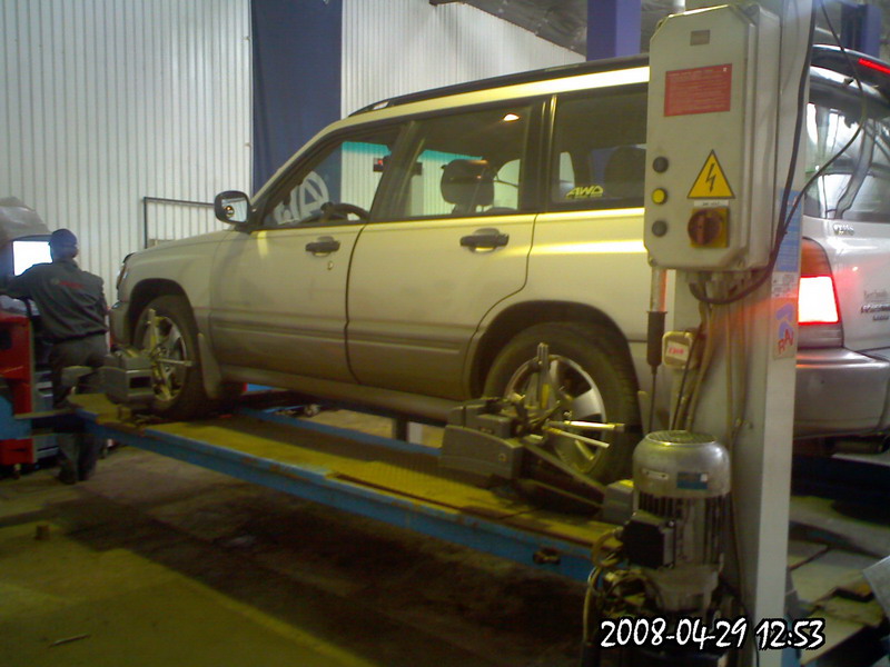 Полностью подвесили авто, на все колеса одели датчики (беспроводные), включили комп, выбрали Форестер, проверили, развал оказался в порядке, сходимость на переде и сзади была нарушена... 15 минут и все в порядке. За эту процедуру я отдал 47 тысяч, зато теперь спокоен что все настроено как положено. Дали даже распечатку - ДО и ПОСЛЕ со всеми градусами и милиметрами...