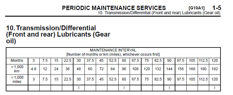 vgn, какого года ваша машинка? Вот согласно этого и надо смотреть какой период замены... Ну и обратите внимание на самую нижнюю строчку - там есть пометки когда именно надо менять... То есть для диффов - около 50000 км пробега... Я понимаю эти таблицы так... :idea2: